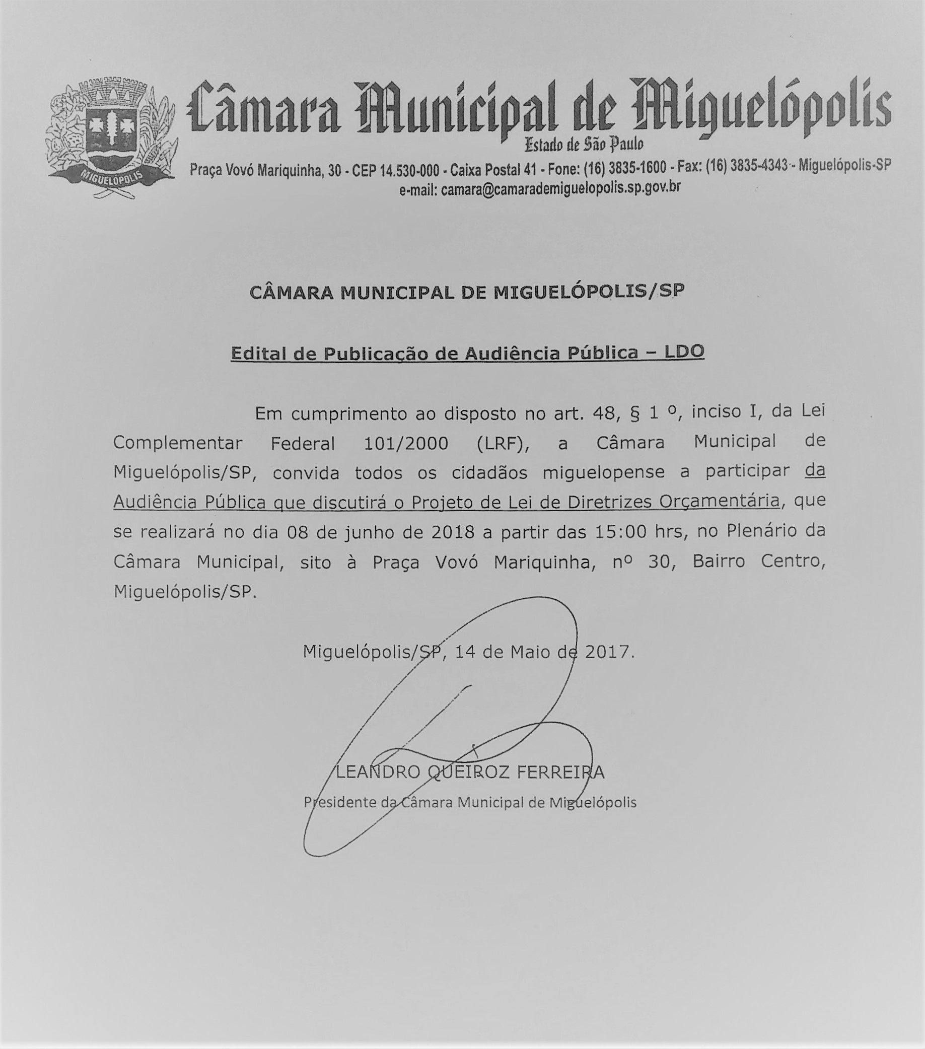 Em cumprimento ao disposto no art. 48, § 1º, Inciso I, da Lei Complementar Federal 101/2000 (LRF), a Câmara Municipal de Miguelópolis/SP, convida todos os cidadãos miguelopolenses a participarem da Audiência Pública que discutirá o Projeto de Lei de Diretrizes Orçamentária, que se realizará no dia 08 de junho de 2018, à partir das 15:00 horas, no Plenário da Câmara Municipal, sito à Praça Vovó Mariquinha, nº 30, Bairro Centro, Miguelópolis/SP.